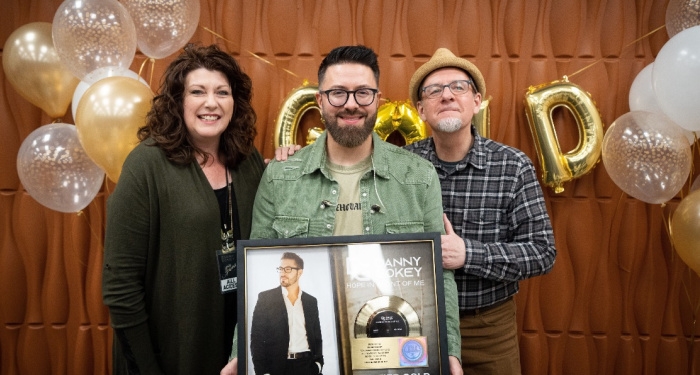 This past Sunday night, three-time GRAMMY nominee and American Idol alum Danny Gokey was surprised with a plaque presentation celebrating the RIAA Gold Certification of his debut CCM single "Hope In Front Of Me." The surprise presentation took place in the middle of a sold-out stop on the Jesus People Tour in Gokey's hometown of Milwaukee, with the commemorative plaque presented by Christian radio veteran Chris Hauser and Gokey's longtime manager, Penny Railey. This marks the third gold certification of Gokey's career, following the gold certification of his singles "Tell Your Heart to Beat Again" and "Haven't Seen It Yet."
